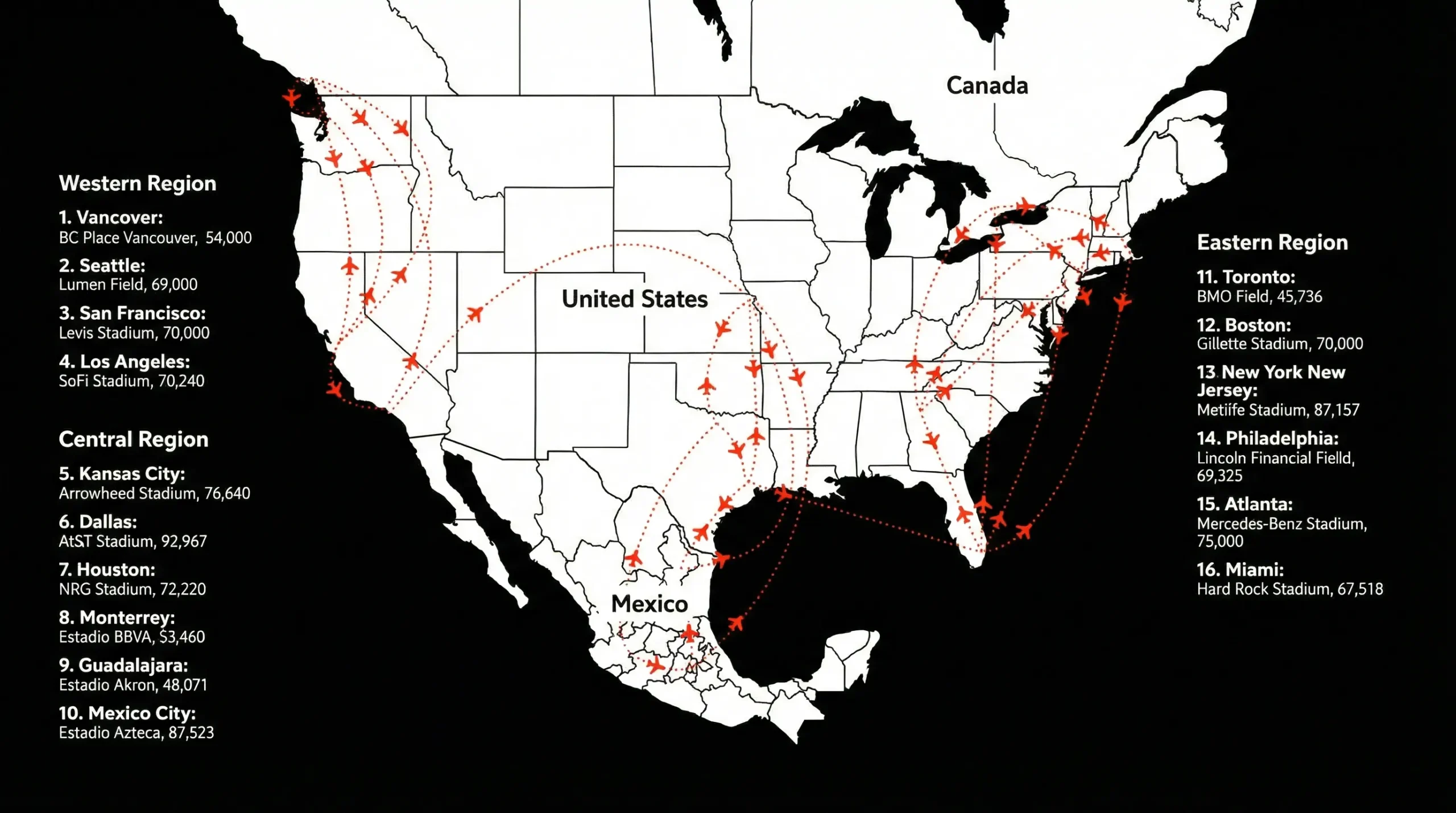 Desde la vibrante Costa Oeste hasta el histórico Litoral Este, nuestra infraestructura operativa abarca las 16 sedes anfitrionas de forma integral. No importa si tu selección juega en la altitud de Ciudad de México, en el dinamismo de Toronto o bajo el sol de Miami; Akio Club despliega una red logística de élite diseñada para eliminar cualquier frontera.